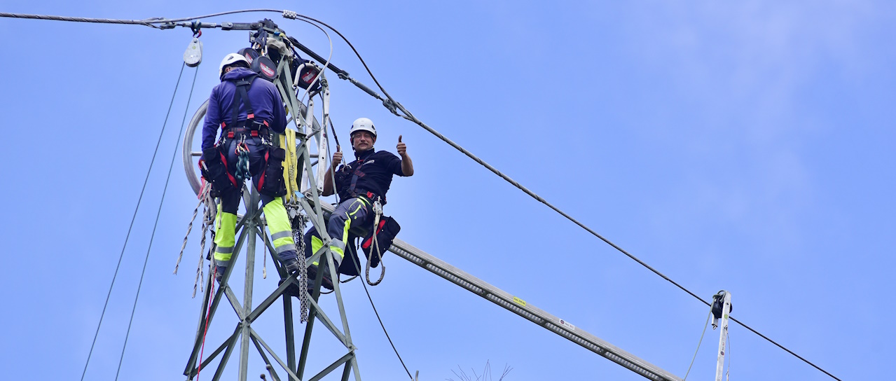 Bilder (Bild 1 / Bild 2 / Bild3): naturenergie netze rüstet die Hochspannungsleitung zwischen Donaueschingen und Blumberg/Zollhaus mit modernem Glasfaser-Luftkabel aus – für bessere Überwachung, schnellere Steuerung und mehr Versorgungssicherheit. Fotos: Roland Sigwart/naturenergie netze GmbH