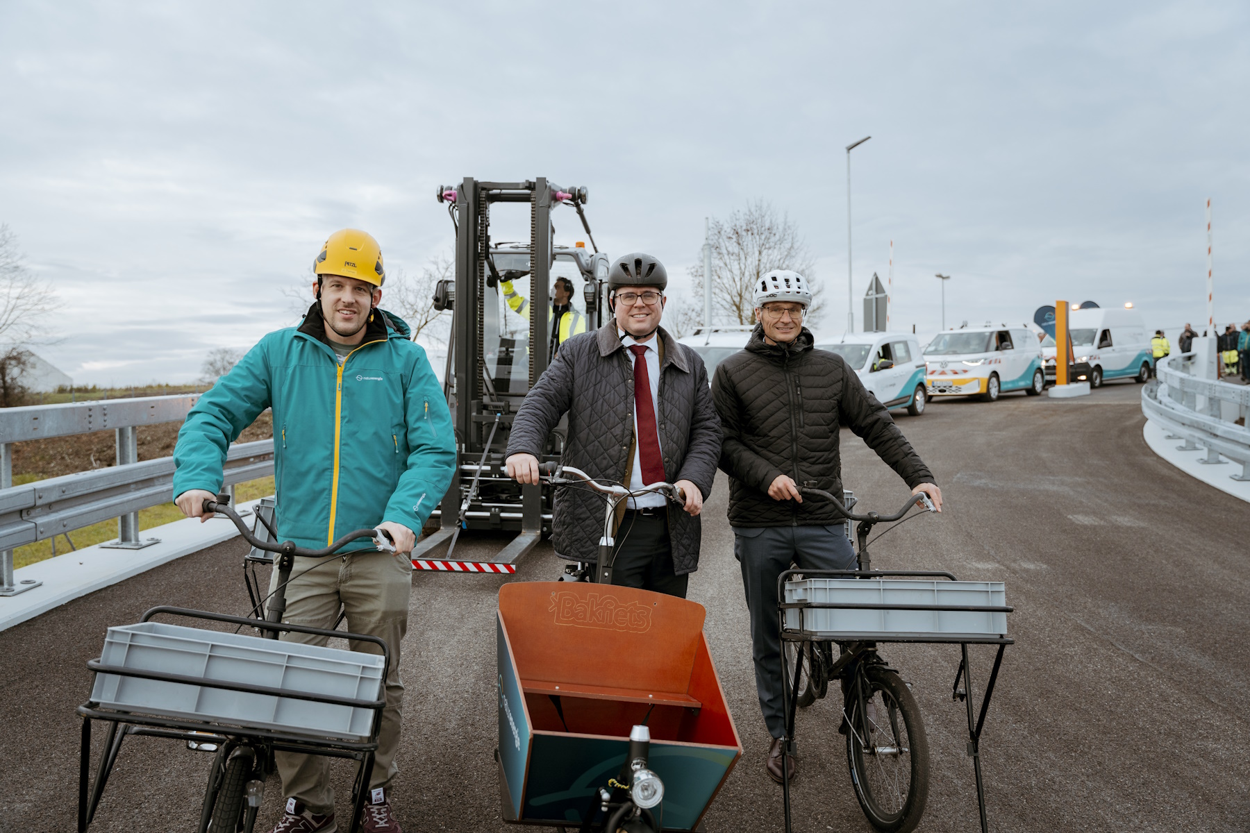 Bild: Strahlende Gesichter beim Eröffnungskorso: Projektleiter Max Schödler, Bürgermeister Dr. Tobias Benz und Daniel Schölderle von der naturenergie-Geschäftsleitung freuen sich über die neue Zufahrt. Foto naturenergie